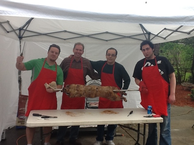 The day begins early for the men of the family who rise at eight am to prepare the whole spring lamb to be barbecued al fresco on a spit. Our family has been celebrating Easter this old country way for as far back as I can remember. When my grandfather did it the lamb was skewered on a long wooden pole over a pit in the yard filled with charcoal and wood. First the lamb is spiked with pieces of garlic all over its body and sprinkled inside and out with salt and pepper. Several halved lemons are trussed into the interior of the belly and the lamb is attached to the spit. The lamb was then tended to and turned by hand for 5-6 hours while being basted with a mixture of lemon, olive oil, herbs and spices. Nowadays we use a commercial grade barbecue pit, with a motorized engine that turns the spit for us! Modern convenience does not change the process of preparation though.