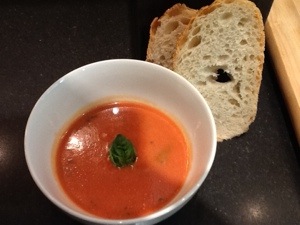 After returning from my hour long grocery shopping trip, I download all the goods and continue to organize my new work space the way that makes sense to me. I speak with the clients about lunch preferences and set in to make the lighter lunch they request. You can seldom go wrong with a grilled cheese sandwich and tomato soup. My version is Cream of Tomato Basil with a ham, cheddar, gruyere and smoked pepper Sandwich.