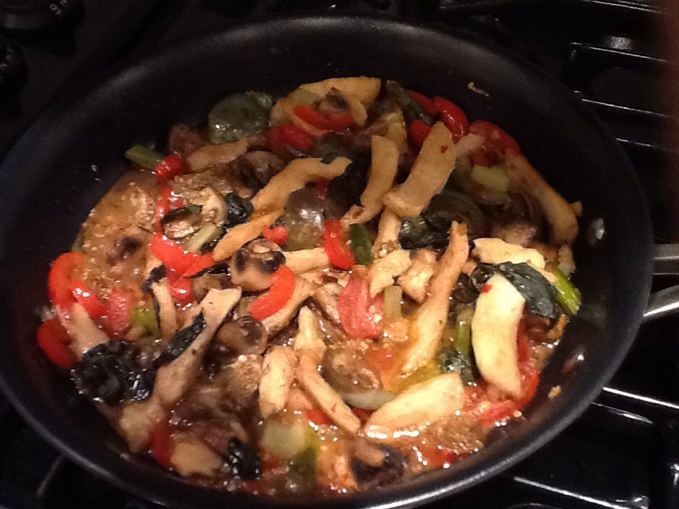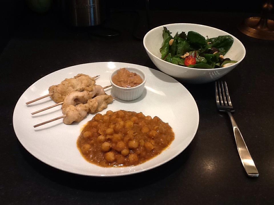 For lunch I repurpose some chicken satay skewers with spicy peanut sauce. I throw together a quick salad with greens, chopped peanuts and a ginger soy vinaigrette. Chana masala is the main dish, full of heavily spiced chickpeas. Warm and warming!