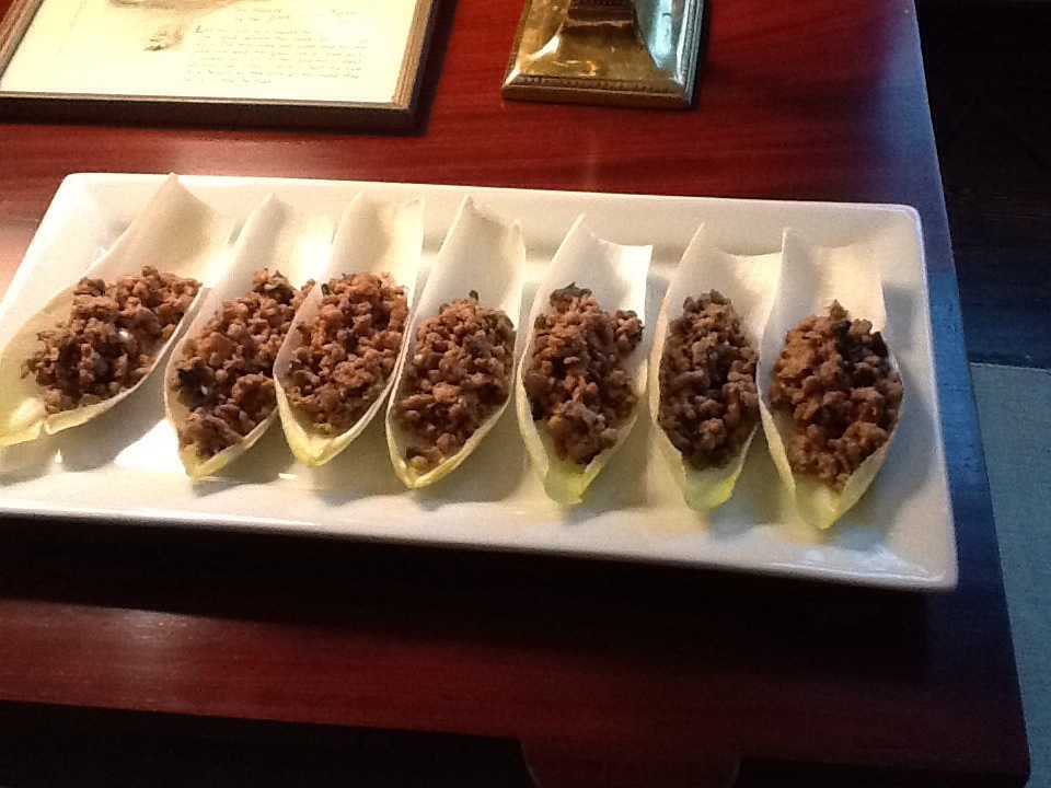 Dinner begins with canapés of larb on endive leaves. Ground pork stir fried with lemongrass, lime, black pepper, garlic, ginger, mint and fish sauce.