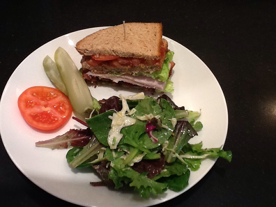 Club sandwich my way with roasted turkey breast, applewood smoked bacon, juicy tomatoes, lettuce and chipotle mayonnaise. A side salad and some fresh market pickles complete the dish.