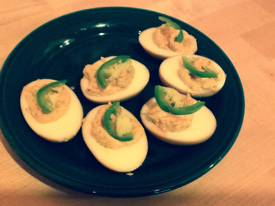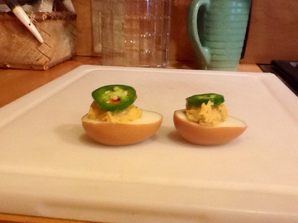 My first attempt at a favorite restaurant’s deviled eggs is a smash hit with my hubby (the unofficial deviled eggs officianado). Mine are lacking the siracha (hard to find up here) but not the soy and jalapeño punch. Boil the eggs for ten minutes, soak in soy sauce for 1 hour, mix yolk with mayo, miso paste, chili powder and paprika, re-fill, top with a couple drops of hot sauce (siracha if you have it) and a slice of jalapeño.