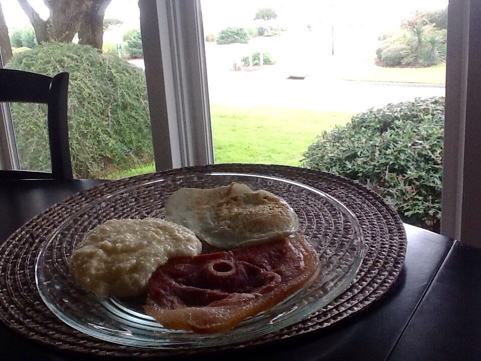 Beautiful view, eggs over easy, cheesy grits and southern-style ham steak….