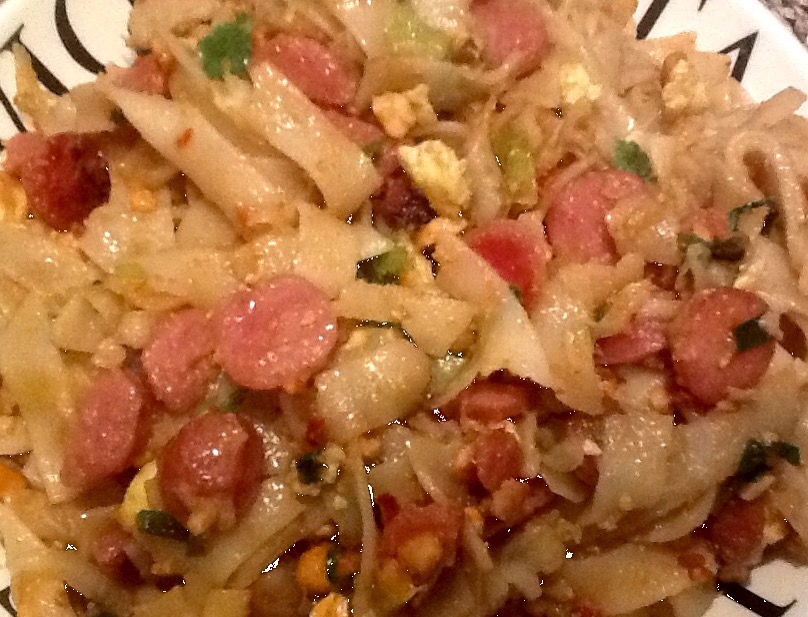 My husband’s favorite ethnic food is Thai. Yes. I said Thai. Not Greek. Not Irish. No ethnicity connection whatsoever. But this man LOVES Thai food. So about 17 years ago I decided it was something I needed to study. I have made Pad Thai so many times that I cannot count them. It is a bit like Mac and Cheese in other households. We eat it often. Tonight I made a slightly different version with XL rice noodles and Lap chang (Chinese sausage). What a wonderful result! Sweet sausage with the spicy peanuty sauce of Pad Thai! The contrast is great!