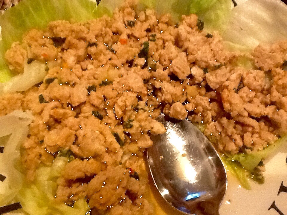 Dish #2 is Larb. Cannot get enough of this stuff! Ground chicken is sautéed with green onion, garlic, chili pepper, fish sauce, pepper (white), lime juice (don’t be stingy)and cilantro. Serve on lettuce cups or over lettuce or cabbage.