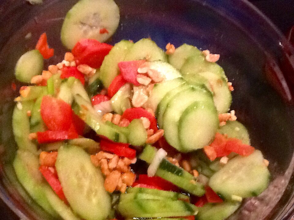 A wonderful side dish for any Thai meal is a cucumber salad. Thinly sliced cucumbers, carrots (I used red carrots for extra color), scallions, chili flakes, rice wine vinegar, sugar, salt and white pepper. Really refreshing!