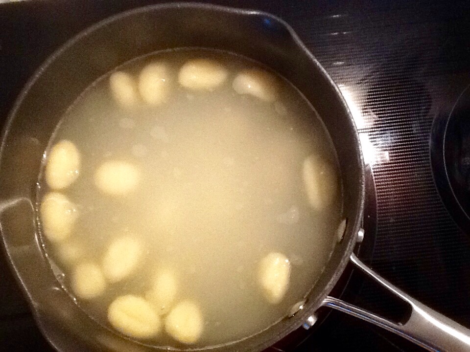A wonderful, rich dinner of potato Gnocchi with langostine tails will change your mind about gluten-free low-cal cooking. The sauce begins with minced garlic, green onion or shallot and tarragon lightly sauteed in olive oil. After sweating the vegetables add 1 cup of corn milk made by food processing fresh or frozen corn kernels.Corn pairs so well with lobster, scallops and other sweet delicate seafood/shellfish! Begin cooking the pre-made (yes I cheated here, but who wouldn’t use such a great gluten free helper?) gnocchi in a pot at medium boil with well salted water.