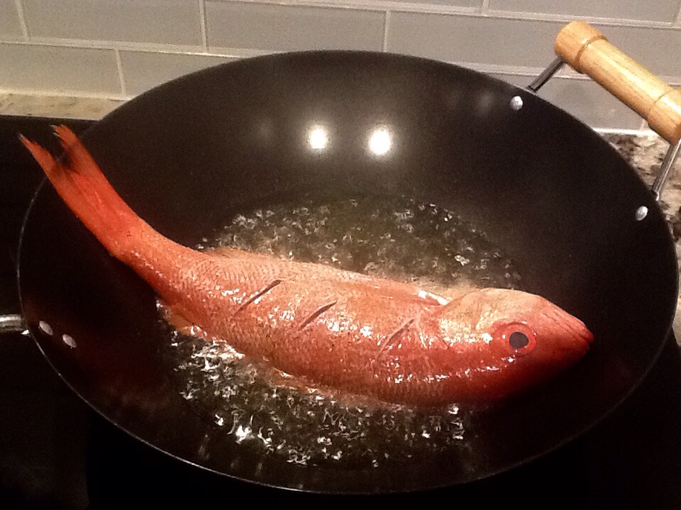 Mr. snapper taking a bath in the hot oil…no seasoning except salt and pepper, por favor…