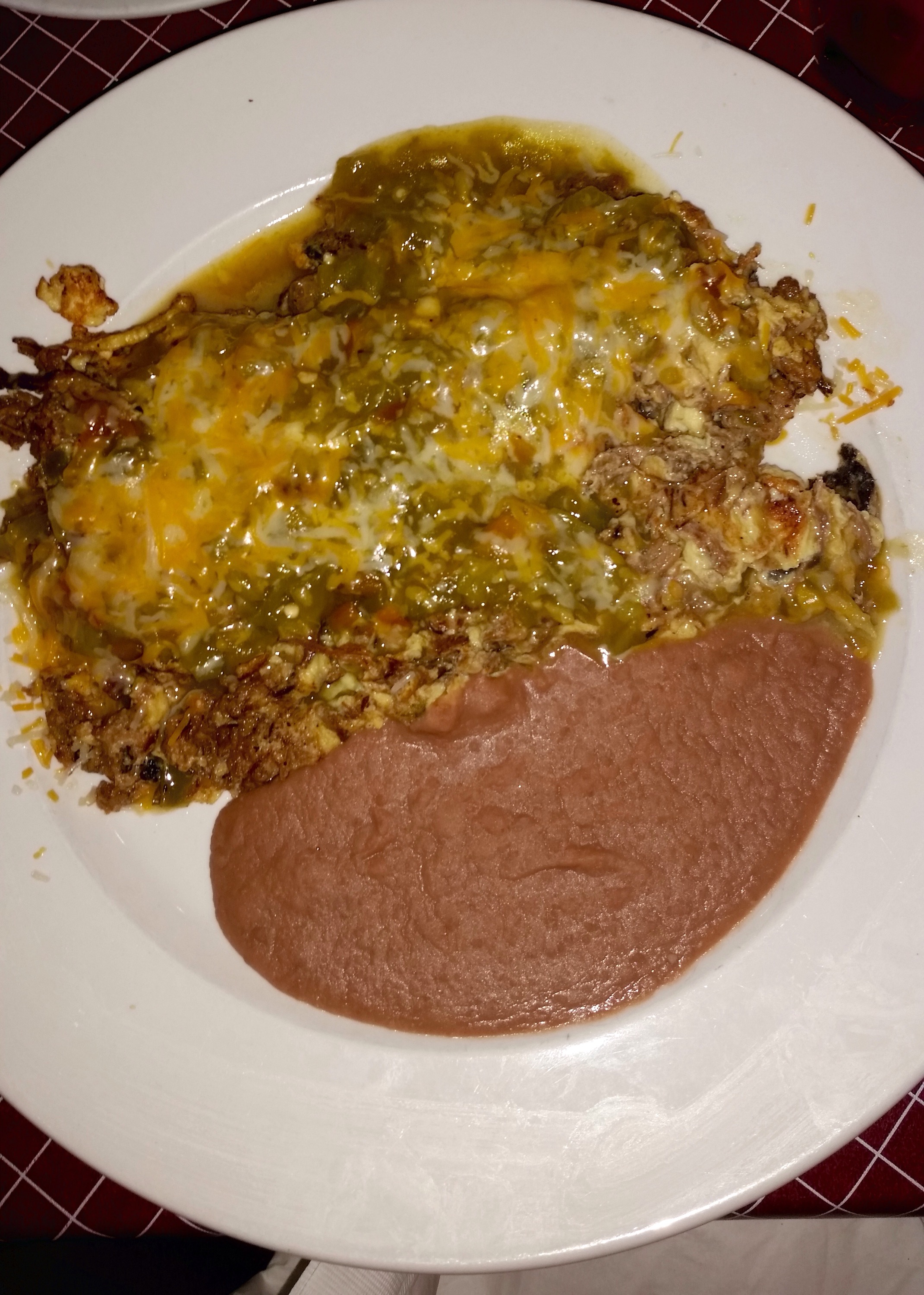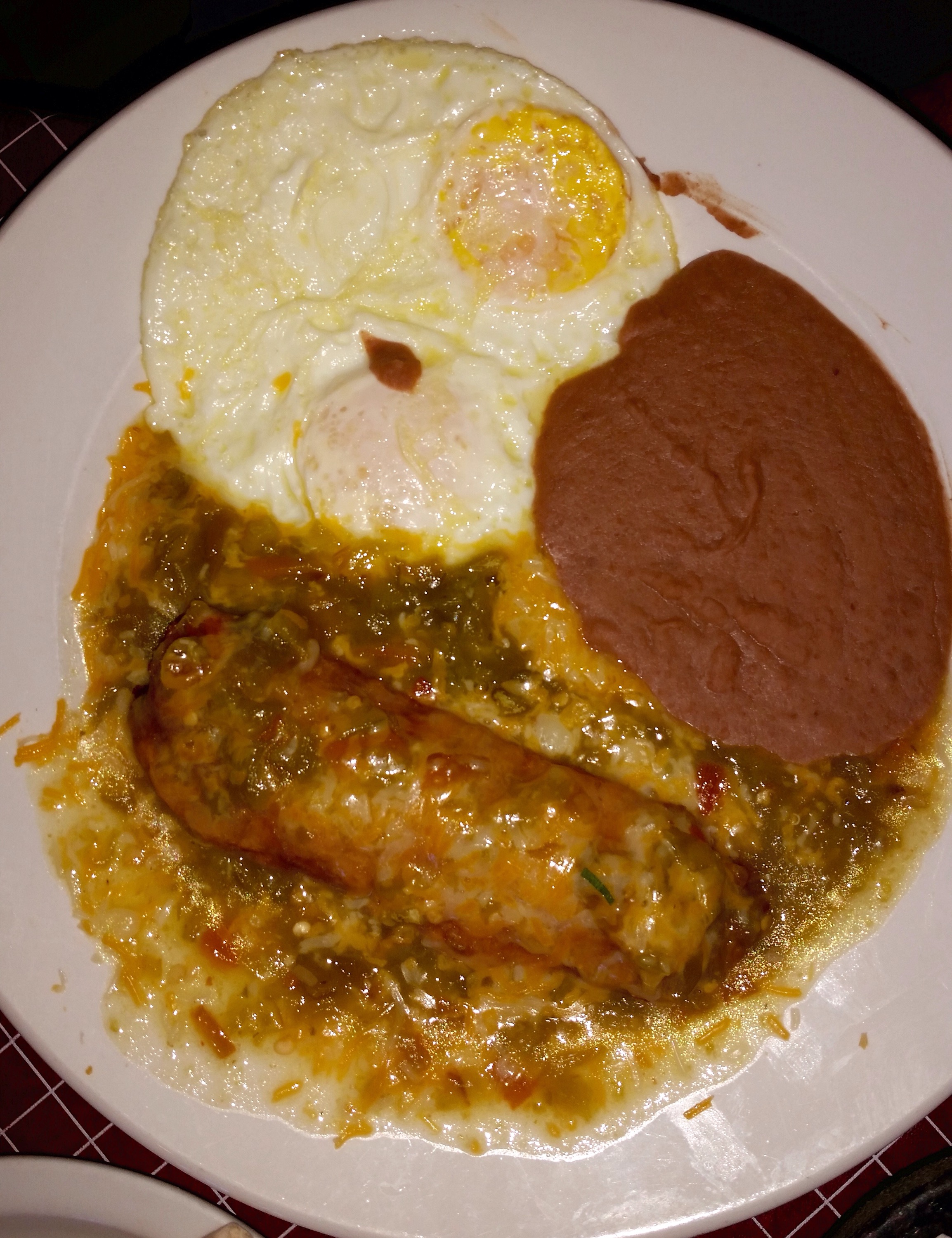 Get anything you order with the housemade Hatch Chile sauce over the top and you will discover why these chiles are so beloved in Tuscon. We ordered eggs with chile rellenos and machaca (shredded dried beef) scrambled eggs, both with the Hatch Chile sauce. Refries accompany both, as do fresh warm tortillas.
