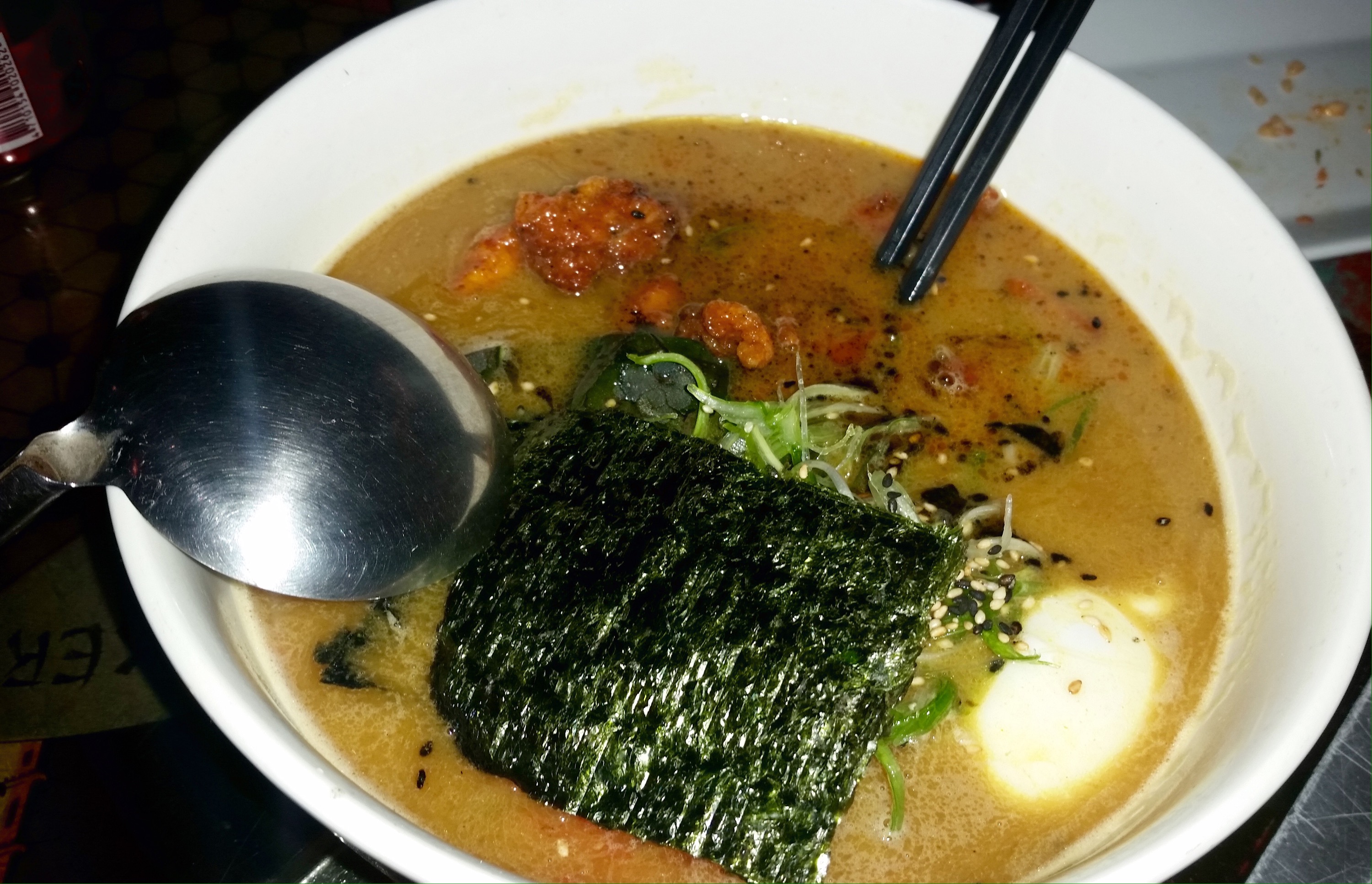 Of the ramen selections our party chose the Kimchi bowl, redolent with pulled pork, greens, kimchi and a soft, soft boiled egg. The other ramen choice was Taipei Curry Chicken with fried chicken, curry, greens and again a very softly boiled egg to stir in.