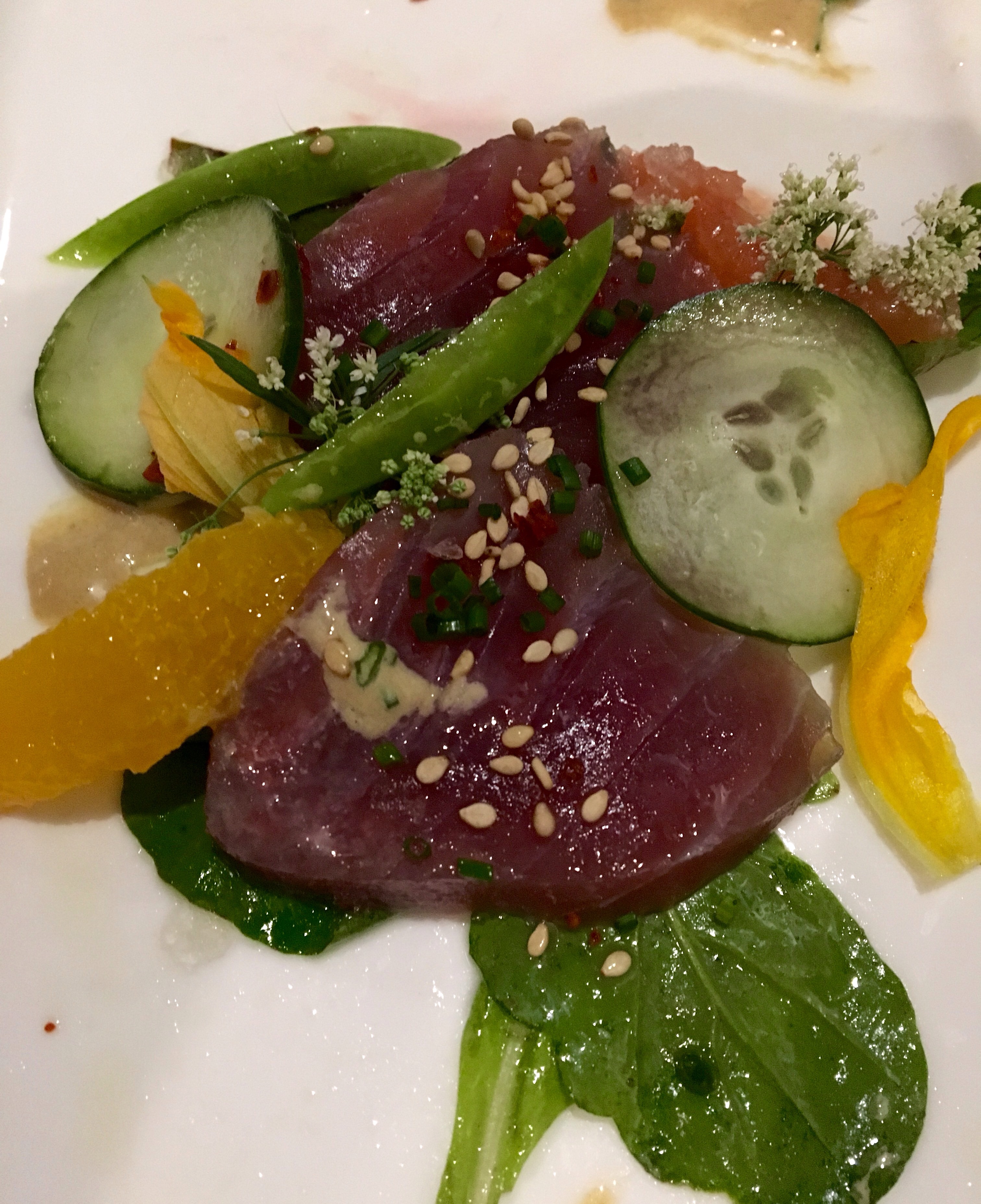 The cured yellowfin tuna was fresh and succulent accompanied by a salad of grapefruit, zucchini blossoms and other little goodies.