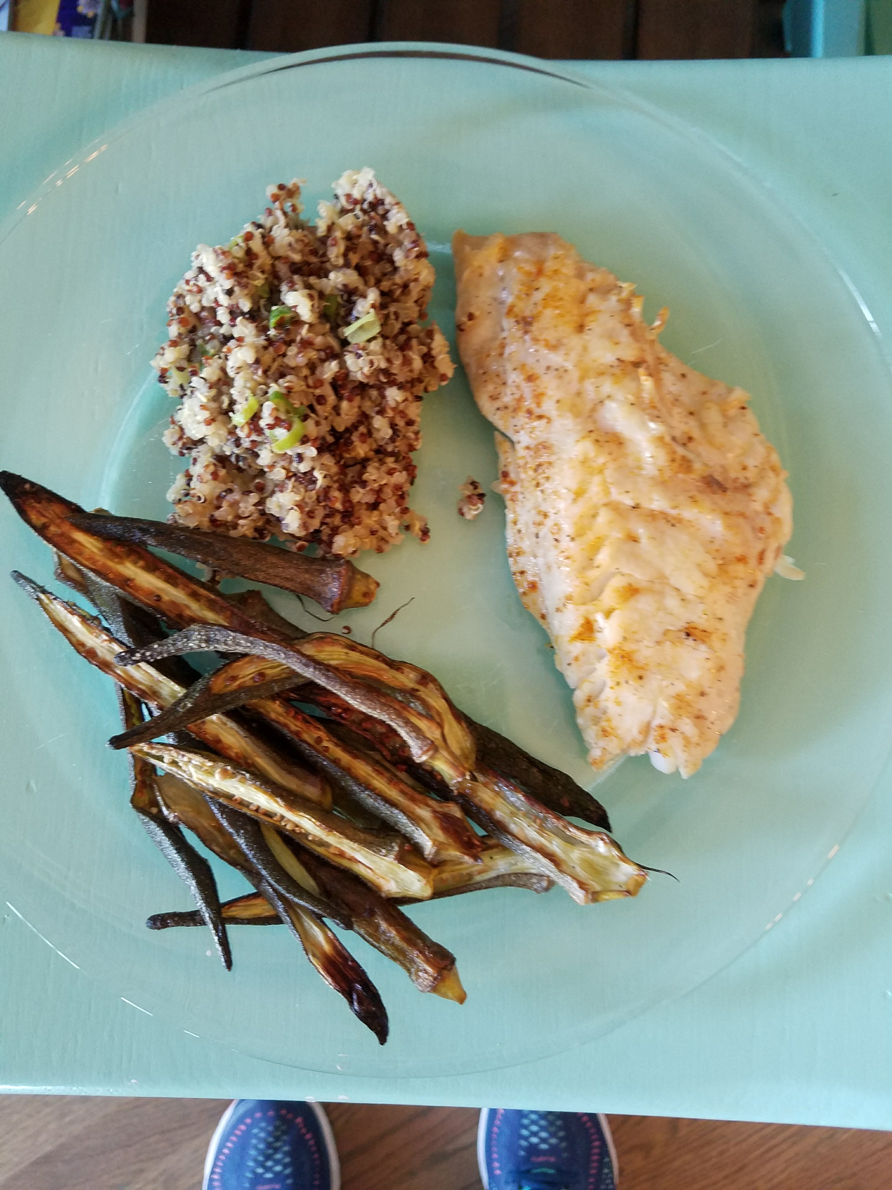 Black sea bass from my favorite fish monger, broiled with a lightly browned butter sauce was flaky and moist. Tri-color quinoa with spring onions rounded out the meal.