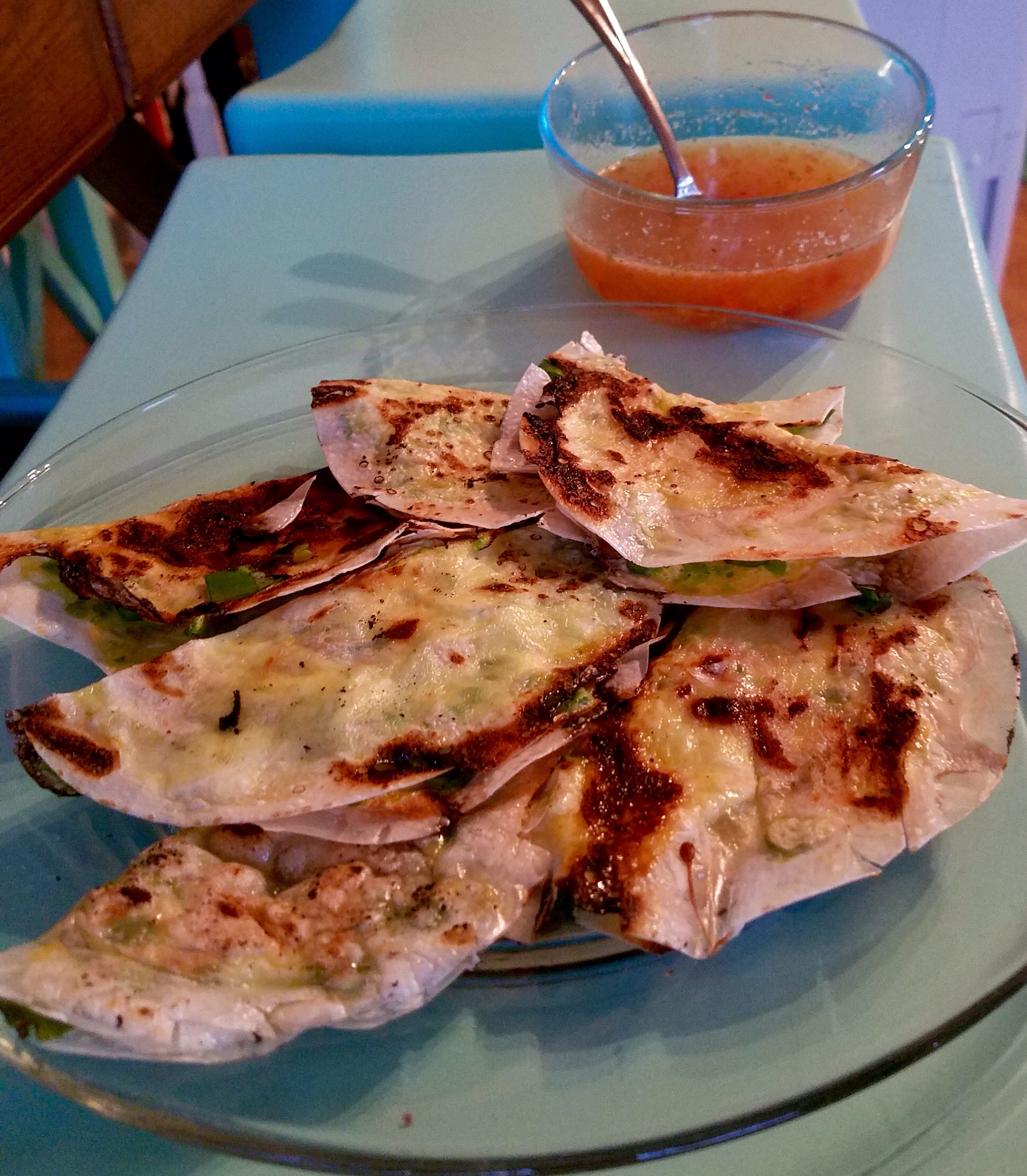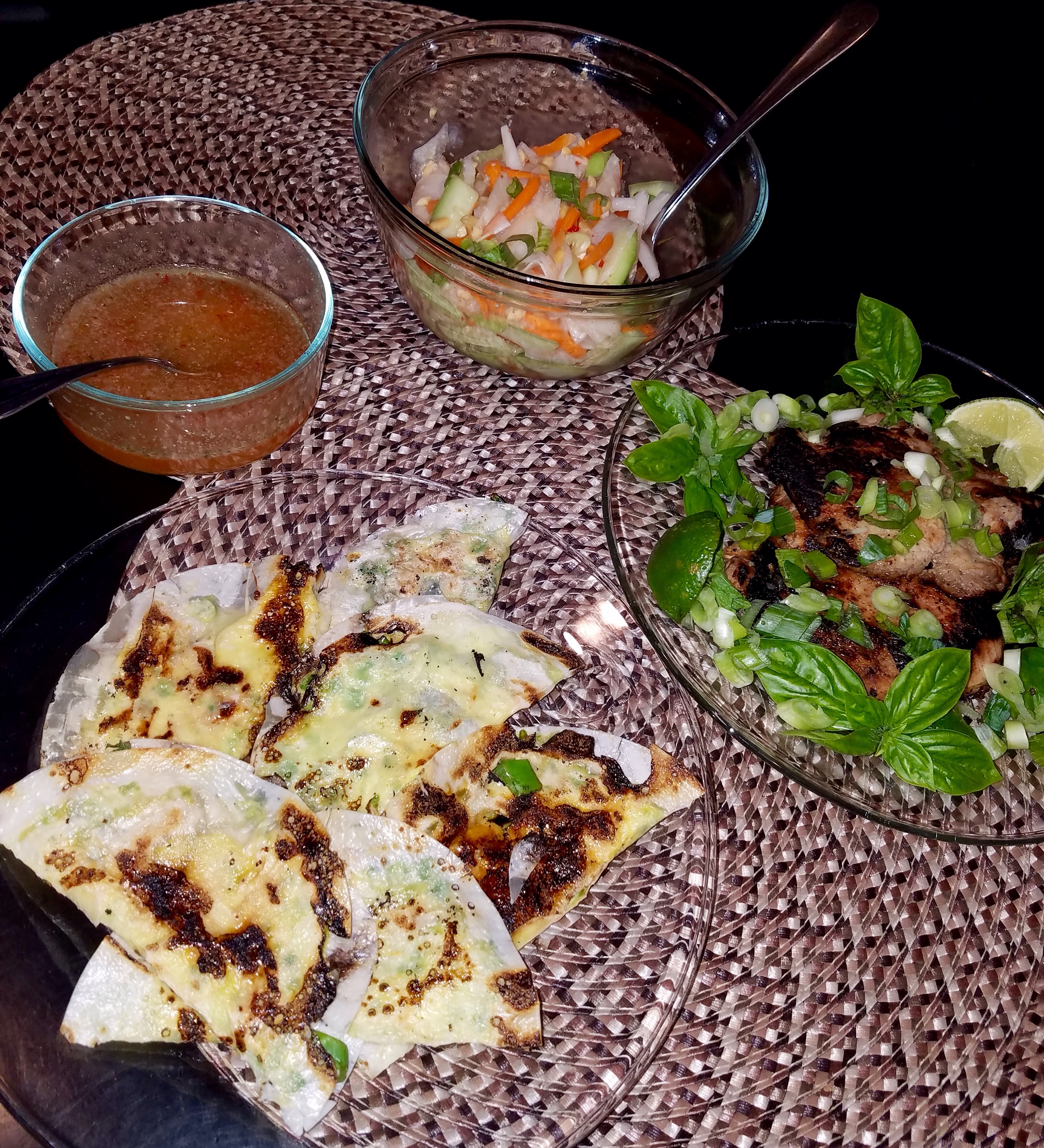 While watching an episode of “Bizarre Foods”, I became intrigued with a new street food sampled by Andrew Zimmern while in Ho Chi MInh City. Bahn Trang Nuong is Vietnam’s answer to the street taco craze. I’ve been wanting to make them for a time because they present a new way to use the rice paper wrappers most commonly seen in the fresh rolls so popular in Vietnamese cuisine. My local Asian Market sells packages of the wrappers in large quantities. It takes months to use them up unless I make them for a party. Making Bahn Trang Nuong for dinner gives me an easy, delicious way to use them up. You can basically fill them with whatever suits your fancy, although the most traditional fillings are a thinly sliced protein, scallions, herbs and a quail egg. Mine are gluten-free and vegetarian. I filled them with smashed fresh baby peas, scrambled egg, scallions, and mint leaves and accompanied them with a classic Nuoc Cham for dipping. I cooked mine over fairly high heat in a cast iron skillet instead of grilling them outside as they do in Vietnam..(alas, my local weather was iffy). The wrappers soften first and then crisp up as they turn from translucent to white to slightly brown.