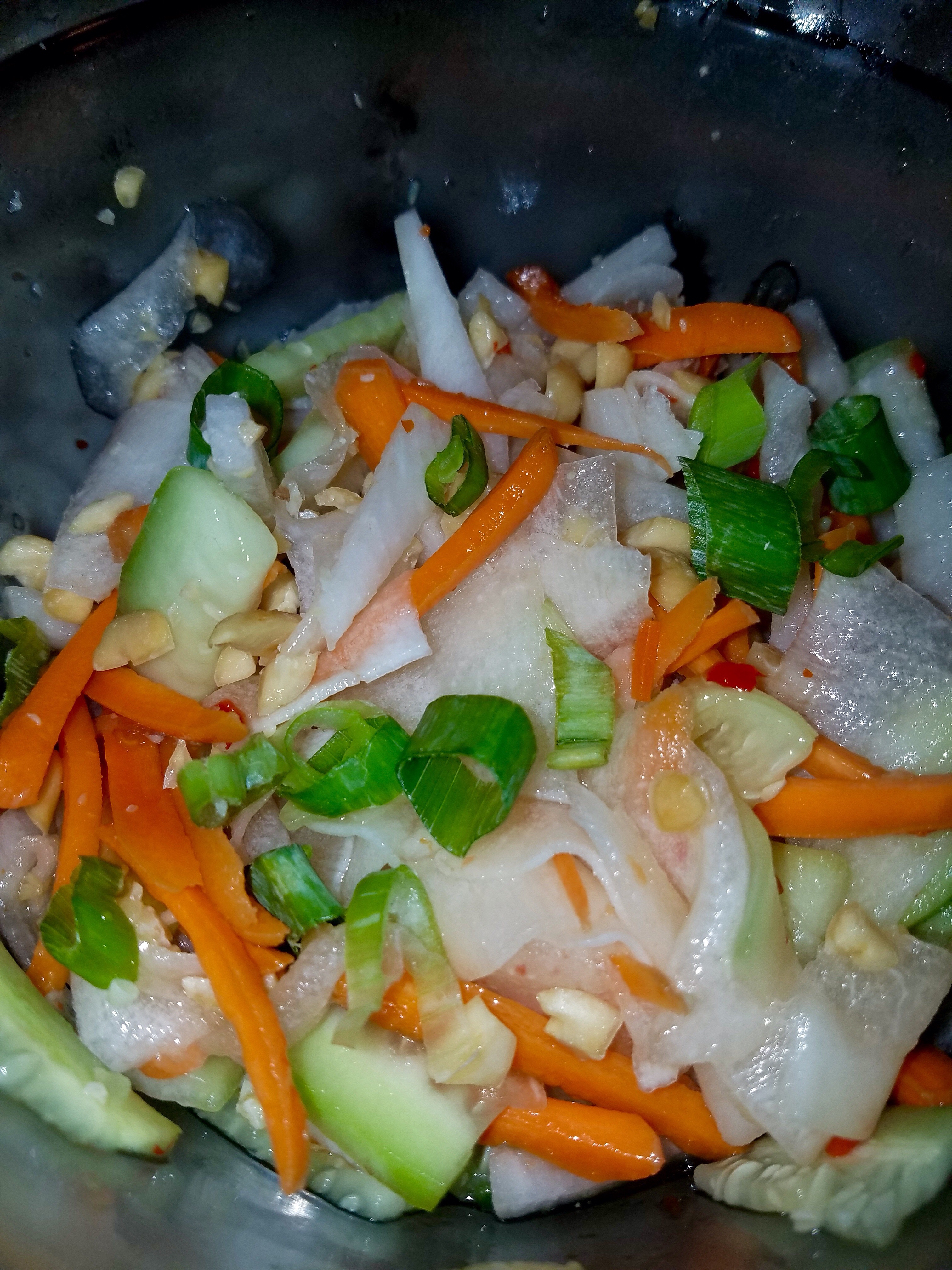 Finally, a wonderful Du’a Chuat (I hope I got that right)…cucumber, carrot and radish salad. I have been making this refreshing salad for years, sometimes even sneaking it into a Thai meal because I love it so much! I like to top it with crushed peanuts and scallions.