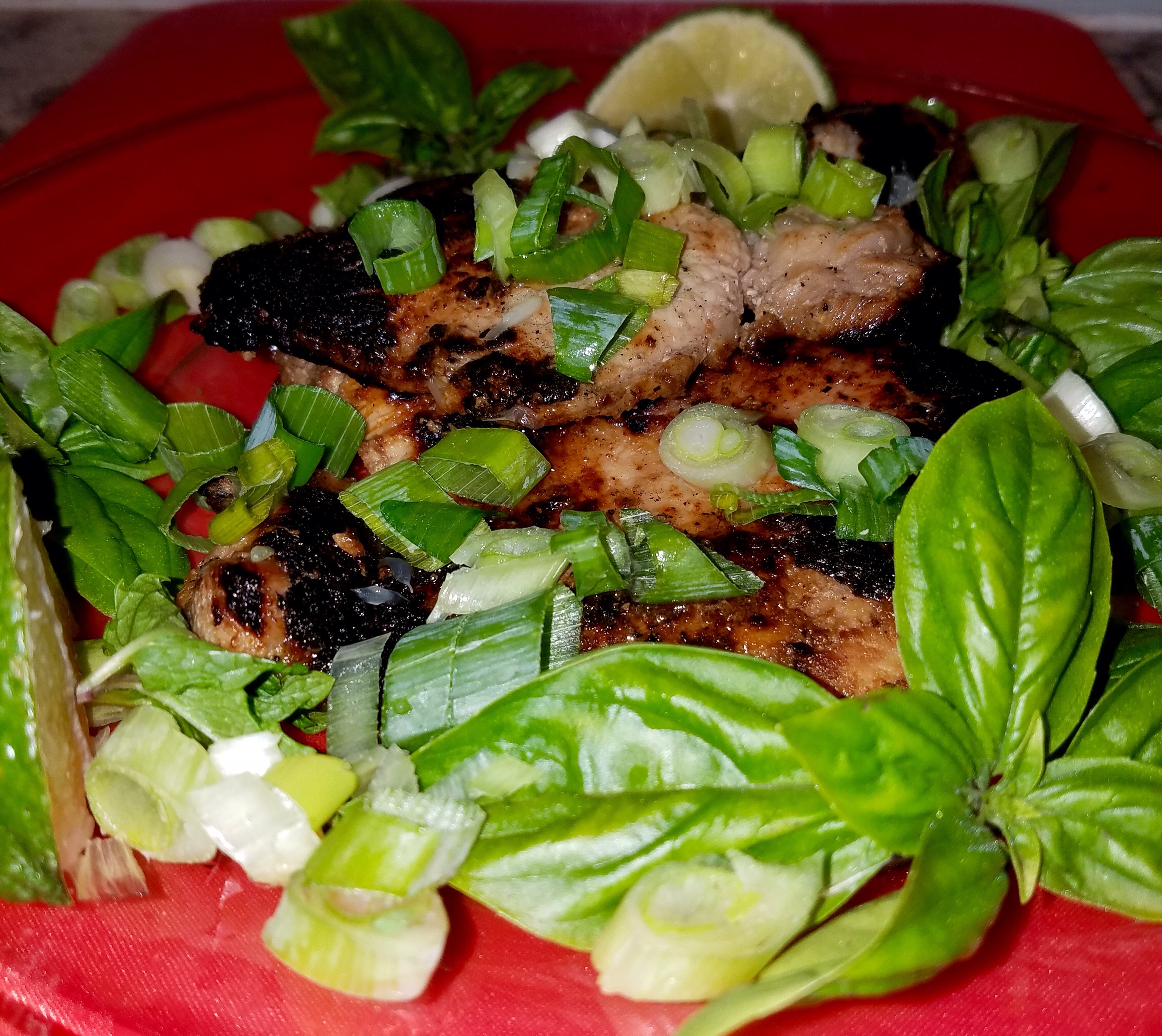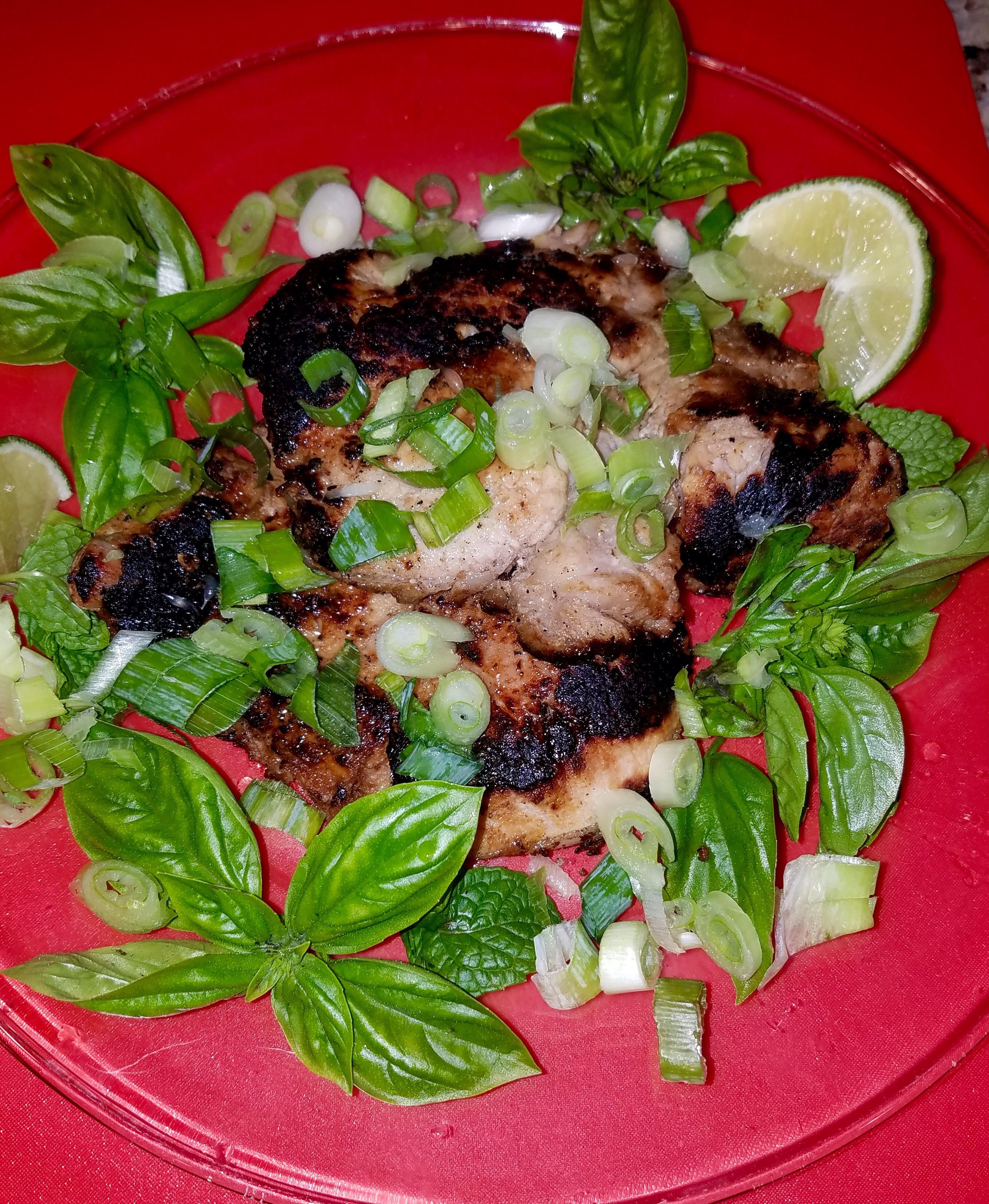 My main dish is Vietnamese Pork Chops, Thit Heo Nuong Xa, also cooked in my trusty cast iron skillet. The pork chops are marinated in fish sauce, sugar, lime, garlic and scallions and peppers. I added a tiny bit of shrimp paste to kick up the flavor even more. Make sure to squeeze with lots of lime juice and garnish with basil and mint!