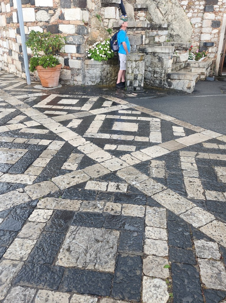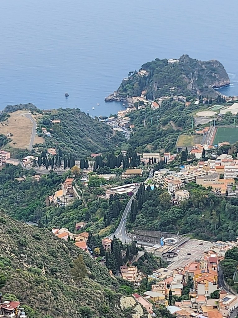 On our way up the mountainside to CastelmolaLunch in TaorminaMy good friend Maria who embroidered my new apron while I waited!Hubby, trying to amuse us as we waited an hour for a bus to pick us up for the ride back down to the port areaThe view!