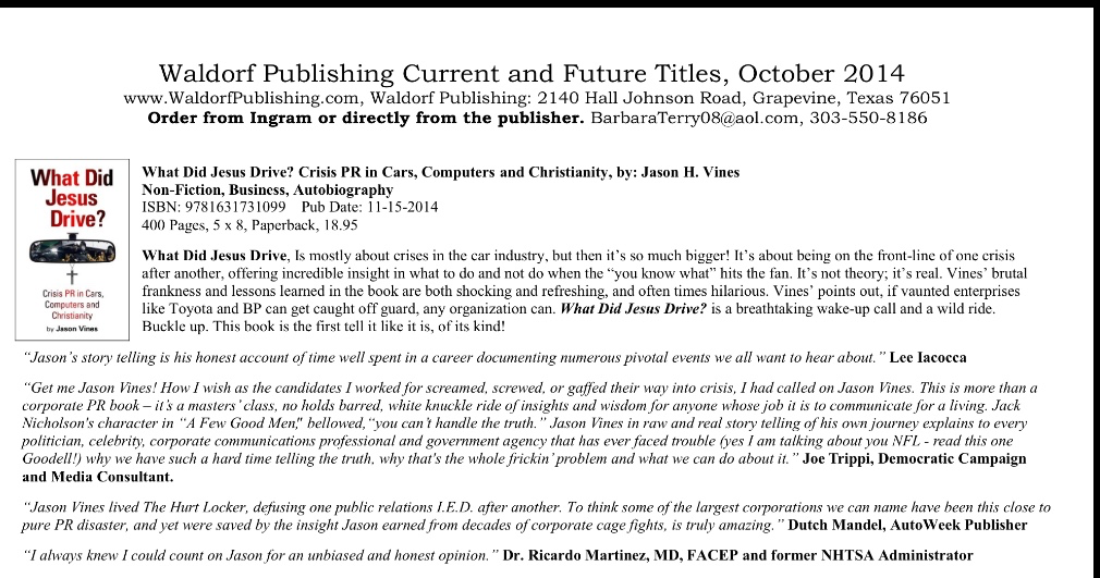 I know, I know…This is a travel and food blog. But I’m just bursting with pride over my hubby’s first book, “What Did Jesus Drive? Crisis PR in Cars, Computers, and Christianity”. Pre-order now on Waldorf Press. Out in print sometime next month. Pick up a copy. It is a wild ride.